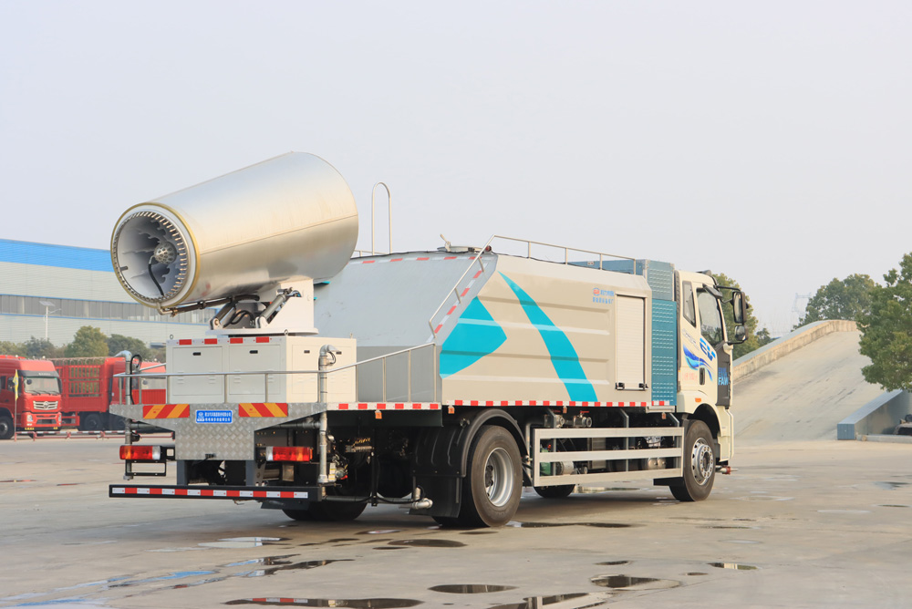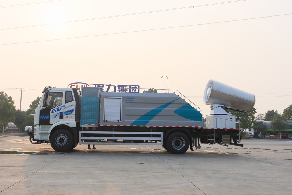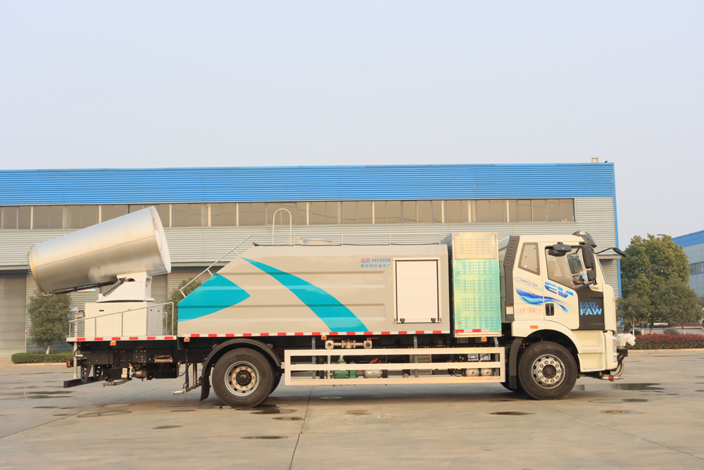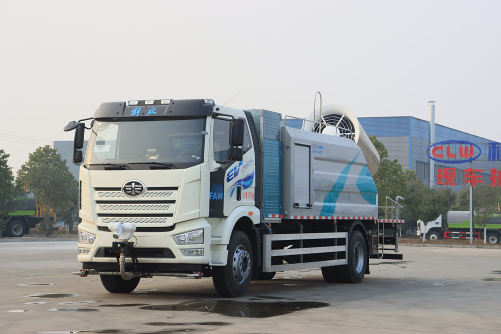 四、其他說明: 解放純電動(dòng)抑塵車是在純電動(dòng)二類底盤的基礎(chǔ)上,加裝低壓沖洗、灑水系統(tǒng)、霧炮機(jī)組,由機(jī)械、液壓(氣路)、電器三部分合為一體的專用灑水作業(yè)車。工作原理:采用自吸式雙級(jí)離心泵,效率高、灑水寬度大、水槍射程遠(yuǎn),低壓水泵由底盤變速器取力器通過傳動(dòng)軸直接傳動(dòng)。霧炮機(jī)組由底盤電池帶動(dòng)霧炮風(fēng)扇電機(jī)、不銹鋼多級(jí)離心泵,進(jìn)行噴霧降塵工作。
