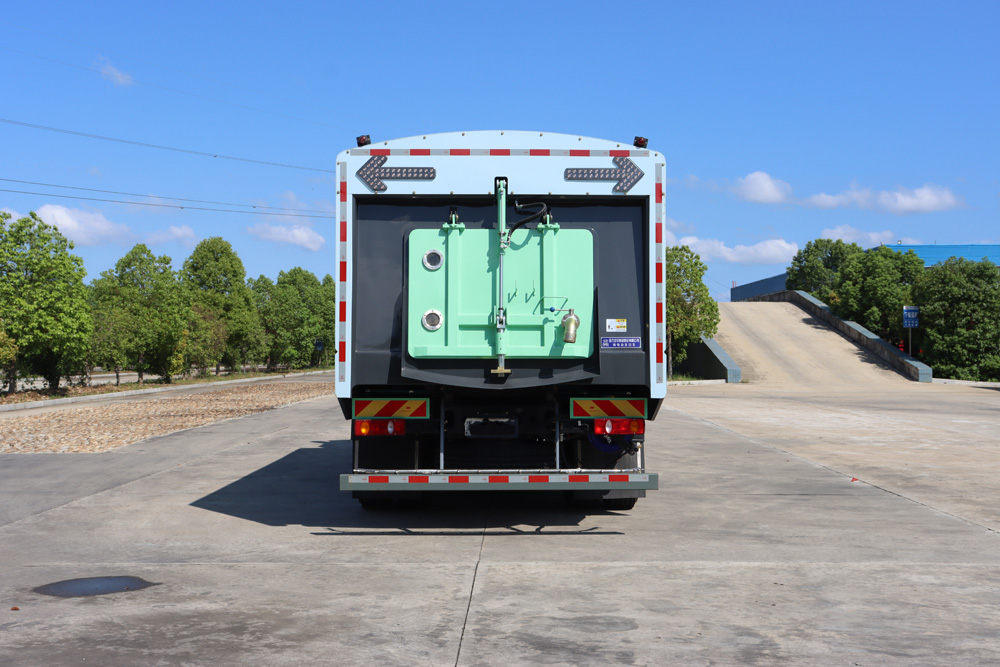 ● 清水箱和垃圾箱分體布置,有效空間利用最大化,一次連續作業時間長。同時在作業過程中可通過污水排放裝置對污水進行排放,隨時加清水繼續作業;垃圾箱采用雙油缸自卸卸料,箱內同時設有大流量高壓噴嘴,可快速沖洗垃圾箱