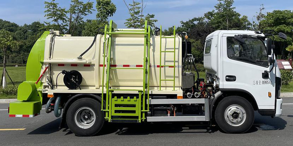 整車為全封閉型,采用電氣液一體化技術,借助機、電、液聯合自動控制系統,通過垃圾箱、上料機構和推鏟等專用裝置,實現垃圾收集和卸料。
