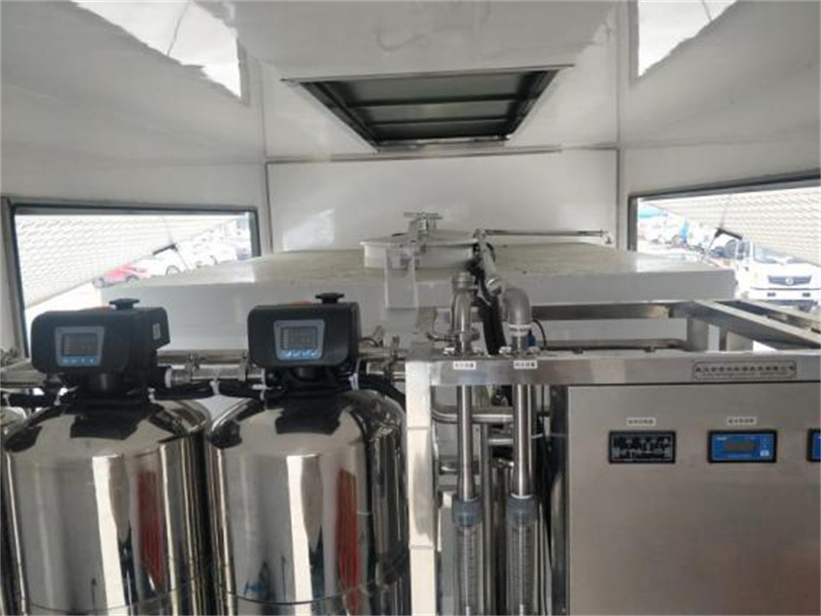 凈水廂體分為前倉熱水鍋爐倉,與后倉凈水倉,凈水倉由6立方不銹鋼水箱,與凈水機(jī)組,發(fā)電機(jī)組,水帶架,管路電氣系統(tǒng)組成。