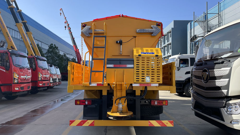 - 融雪撒布機可撒布鹽、砂、融雪劑等多種融雪物料,撒布寬度和撒布量可調節控制,計量穩定、準確、可靠,撒布寬度一般為 2-14m,撒布量為 20-300g/m² 可調 。撒布機采用碳鋼板或不銹鋼結構,具有良好的耐腐蝕性,動力組選用國內知名品牌發動機,性能穩定。其采用 V 型料倉,結構簡單可靠,使融雪劑自動落料,出料完全,無殘留,并且上置過濾網可減少大顆粒或雜物進入設備,保證機構安全運行,防滑輸送帶則保證了融雪劑輸送連續、均勻.