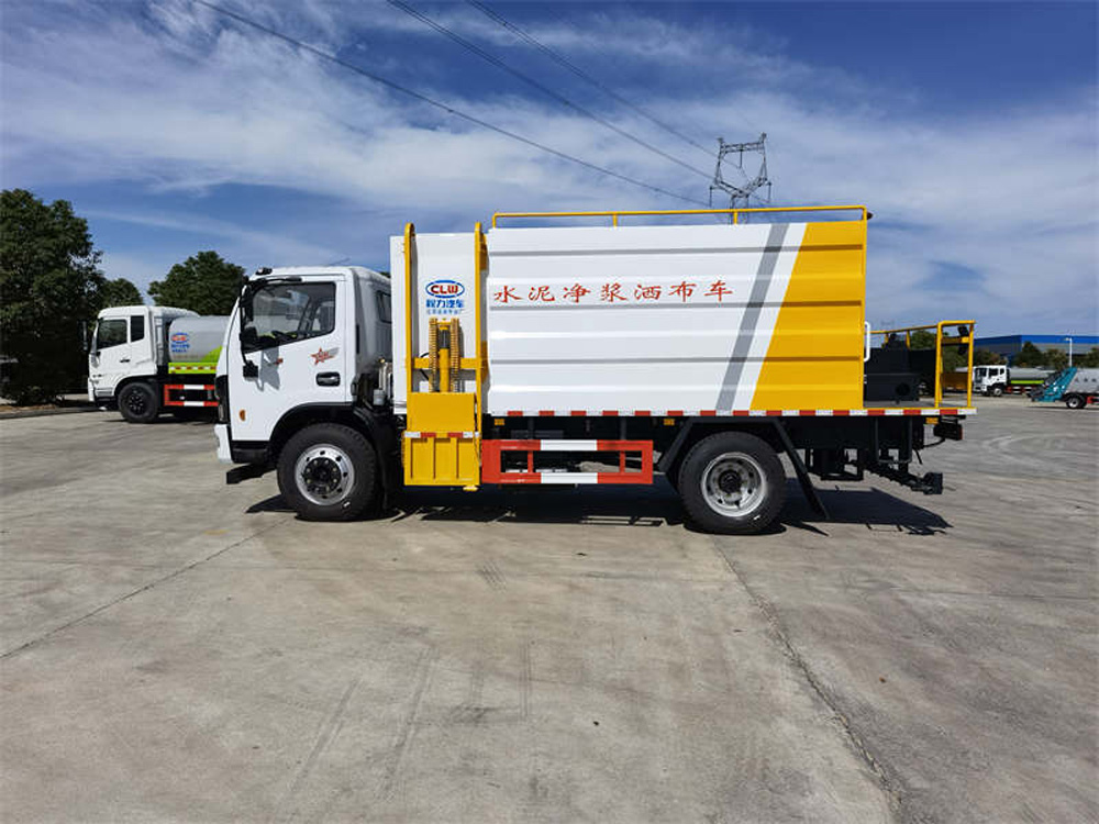 該車特點 水泥罐、清水罐采用 Q235 優質碳鋼制作,高壓水泵,水泥泵(專用),攪拌系統,液壓系統,水罐到攪拌罐供 水系統(渣漿泵),15 米高壓清洗管道(帶卷盤、手持清洗槍),減速分動箱(車輛在行駛工作過程中將車速減慢 從而達到更加理想的灑布效果),尾部 14 個水泥漿專用噴頭,最大灑布寬度 4 米。標配水罐向攪拌罐供水系統,標 配提升裝置(用于袋裝水泥向罐體頂部運輸)。