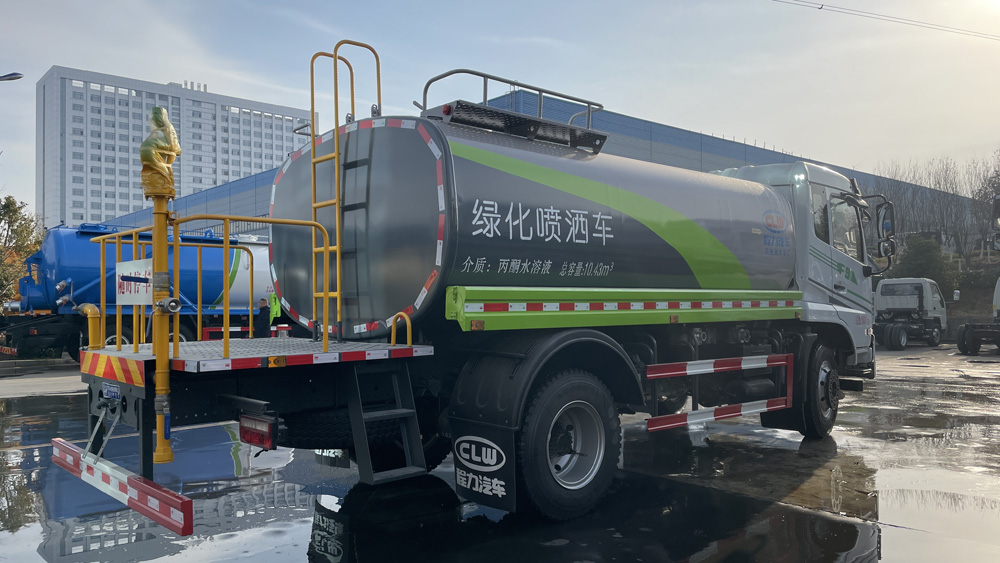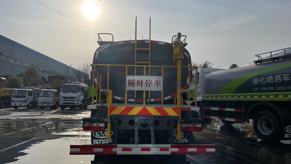 四、其他說明: 罐體由國標5mm厚優質碳鋼板一次性卷壓成型,二保焊行走小車自動焊接,焊縫均勻、美觀,避免了人工焊接的漏焊和虛焊,罐體內部加固處理,并設置防浪板,罐體內外做防銹處理,標配前沖、后灑、側噴、后置式工作平臺,平臺帶踏梯,四周有安全護欄,平臺上設有高壓水炮,可360°旋轉,可調成:直沖狀、大雨、中雨、小雨、毛毛雨。