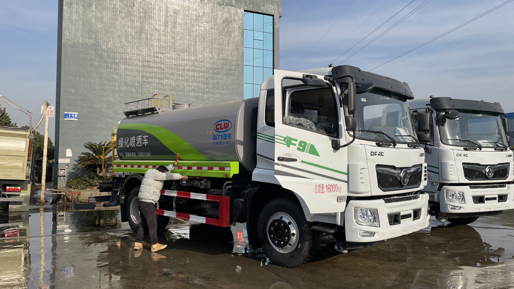 三、選裝配置: 選配駕駛室內電控氣動操作;大鴨嘴前沖噴頭壹對;萬向前沖球閥;路面沖洗水管卷盤;本田高壓水泵,水槍可沖洗人行道、移動洗車等; 藥盤;長警燈,LED箭頭燈;罐側帶閘門,罐后加裝噴霧降塵裝置;灑水車泵標配程力泵選配杭州威龍泵;可對主管道加粗,可選316大口徑球閥;罐體內防腐、保溫、襯塑處理,灑水車作運水車用可加裝自流口。運熱水罐體可做保溫,運生活用水可做食品級304不銹鋼罐體。