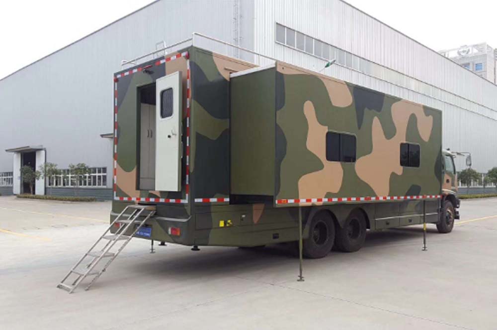 艙體結構具有環境適應性好及具有多種防護性能,具有隔熱保溫、隔音、防水,防火、防熱輻射、防海洋鹽雯腐蝕、防蟲蛀等性 能。 電氣系統:電氣系統主要有供電系統、配電系統、操控系統和照明設備組成,廂體內所有電器線路均為暗線布置,走線安全簡潔。集中在控制面板上統一控制,滿足絕緣和防雷設計的需要。 裝飾和防腐;所有暴霞金屬面均進行防腐外理,表面噴涂采用軍綠亞光油漆,或根據客戶要求制作,外部涂具質量應符合OC/T484汽車油漆涂層的相關要求及GJB1379軍用汽車的顏色與涂層的相關要求。 車廂內部空間分為住宿間和衛生間 2個部分。 整車外形尺寸(mm)長11750*寬2550*高3600 方艙外部尺寸 長9400*寬2460*高2100 方艙內部尺寸 長9300 寬2300 高 2000